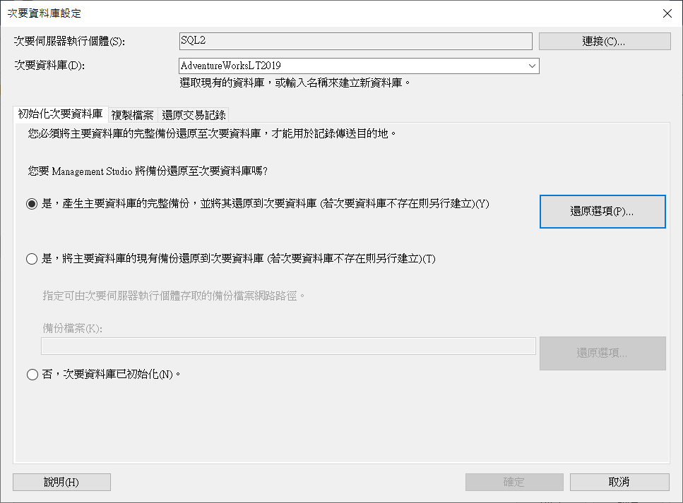 如果 Secondary 不存在目標資料庫,可以使用初始化次要資料庫進行建立。