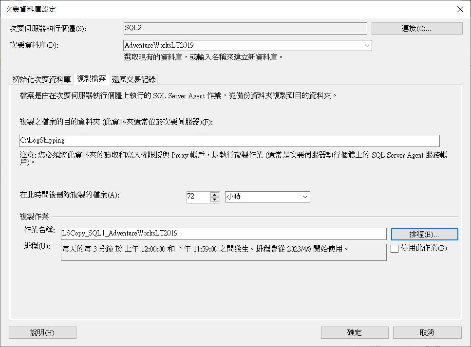 接著設定複製交易紀錄的 JOB,設定 Secondary 的路徑以及進行複製的排程,預設是 15 分鐘。