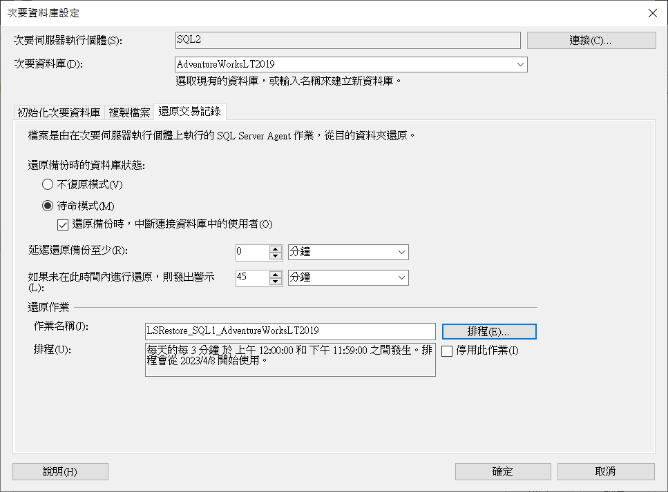 最後設定還原交易紀錄的 JOB,預設是 15 分鐘,這個步驟可以設定 Secondary Server 要保持在 Recovery (無法被讀取、寫入) 或是 Standby (可以被讀取) 等狀態。