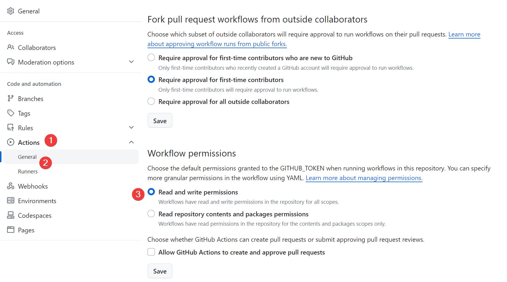 - Settings "Workflow permissions" : "Read and write permissions" : 解決 GitHub Action 執行 發生 '/usr/bin/git' failed with exit code 128 權限不足的問題