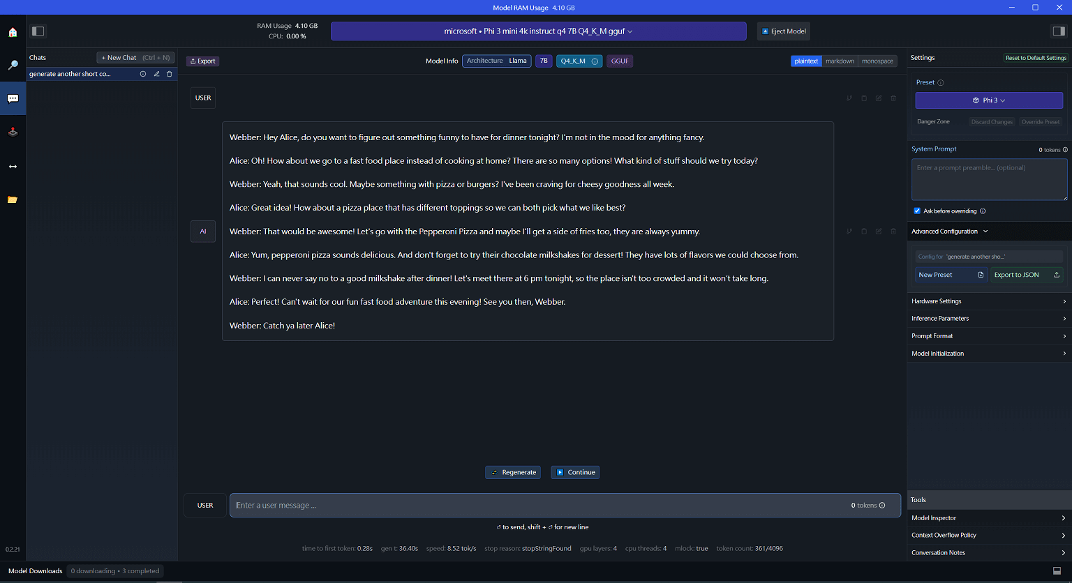 本次示範使用 Microsoft Phi-3 7B 模型,在 AI Chat 當中測試生成,與 Azure OpenAI 的介面相仿,但多了更多友善的功能 (複製、設定),最大優點是用介面的方式就可以達成 LLM 的下載、載入與管理 😀