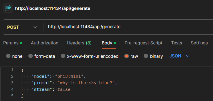 示範如何透過 PostMan 來 Post 至 ollama api,注意要使用 json format 當作 payload。