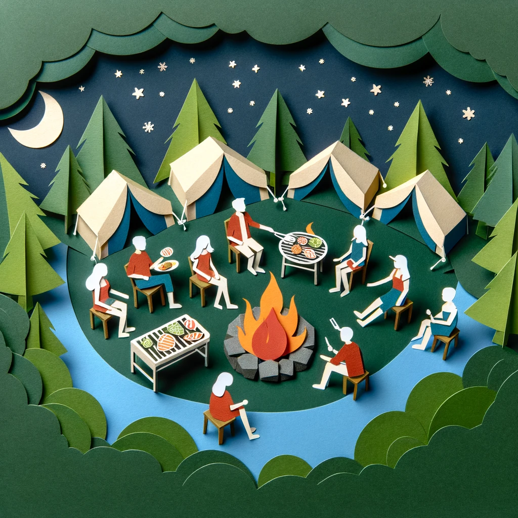 A paper cutout illustration depicting a group of people camping and barbecuing. The scene shows several people, each with distinct, colorful paper cutout outfits, gathered around a campfire. There's a grill with food, and some tents are set up in the background. The background is created from dark green textured paper representing the forest, and a starry sky made from dark blue paper with small white dots for stars. This artwork captures the cozy atmosphere of an outdoor camping adventure.