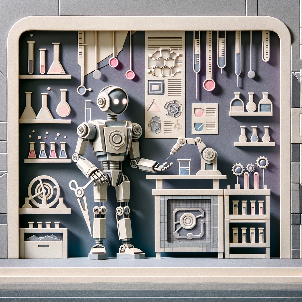 A paper cutout illustration depicting a robot working in a laboratory. The robot, designed in a futuristic style, is shown handling various scientific equipment. The background features textured paper that represents the interior of a high-tech lab with shelves filled with test tubes and scientific instruments. The overall color scheme includes shades of gray and metallic for the robot, and various vibrant colors for the lab equipment to create a dynamic and engaging scene.