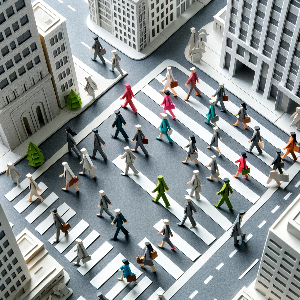 A paper cutout illustration depicting a bird's-eye view of a group of office workers walking on a city street. The people are shown in various professional attire, crafted from colorful textured paper. The street is designed with shades of gray and white paper, representing a bustling urban environment. Buildings around the street are also made from paper in different colors and textures, indicating a dense cityscape. The overall scene captures the busy and dynamic atmosphere of a metropolitan area.
