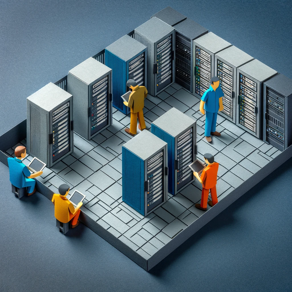 A paper cutout illustration depicting a bird's-eye view of three engineers working in a server room. The engineers, shown in different colored professional attire, are interacting with large server racks. These racks are crafted from metallic and gray textured paper, symbolizing the technology and hardware. The floor of the server room is designed with dark blue textured paper to represent a clean and organized technical environment. The overall scene portrays the complexity and detail involved in maintaining a modern data center.