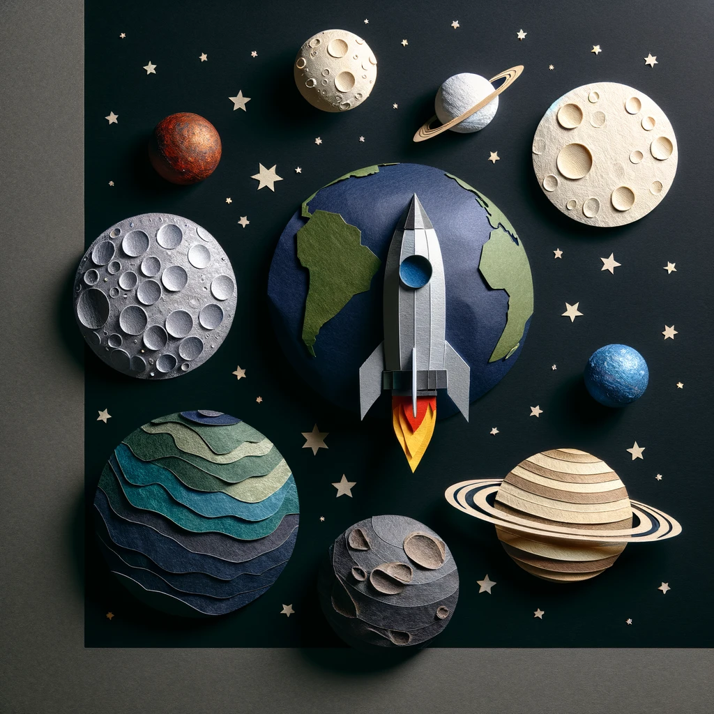 A paper cutout illustration depicting a rocket flying through space, accompanied by Earth, the Moon, Venus, Mars, and Saturn. The rocket is designed with metallic paper, showing a sleek and futuristic look. Each planet is uniquely represented with different colored textured papers: Earth in blues and greens, the Moon in gray, Venus in pale yellow, Mars in red, and Saturn with its rings in yellow and brown. The background is a deep black textured paper, dotted with small white paper cutouts to represent stars, creating a vast cosmic landscape.