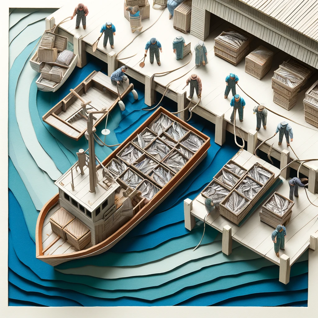A paper cutout illustration depicting a bird's-eye view of workers unloading fish at a dock. The workers, shown in various shades of blue and gray outfits, are actively moving crates of fish from a boat to the dock. The boat is crafted from brown textured paper, and the dock is represented with gray and dark brown textured papers, giving a rugged, wooden appearance. The sea is illustrated with layers of blue textured paper, enhancing the coastal scene. This artwork captures the bustling activity of a fishing dock.