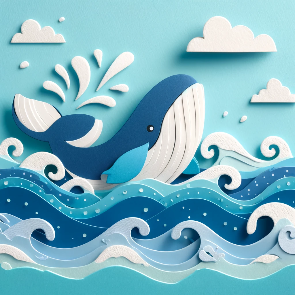 A paper cutout illustration depicting a whale playing in the ocean. The whale, rendered in shades of blue and white, is shown splashing in the water, creating dynamic waves around it. The ocean is represented with various shades of blue textured paper, giving the impression of depth and movement. The sky above is a light blue textured paper, dotted with white paper cutouts for clouds. This scene conveys a sense of freedom and playfulness in the vast ocean.