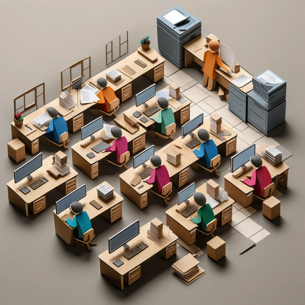 A paper cutout illustration depicting a bird's-eye view of an office setting where people are working with computers and photocopiers. The scene shows several office workers, each crafted from colorful textured paper, seated at desks with computers and using a photocopier. The desks are represented with brown textured paper and the equipment with gray and black papers to illustrate technological devices. The office floor is a subtle gray textured paper, suggesting a typical office carpet, creating an atmosphere of a busy, functional workspace.