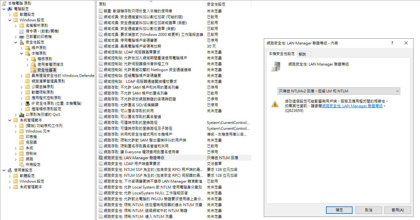 這次團隊內遇到的問題是因為伺服器 secpol.msc 的調整,部分伺服器已經調整為 只傳送 NTLMv2回應,拒絕 LM 和 NTLM 而部分伺服器還沒。造成伺服器間的 AD 驗證無效。