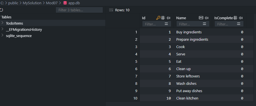 new TodoItem { Id = 3, Name = "Cook", IsComplete = false },