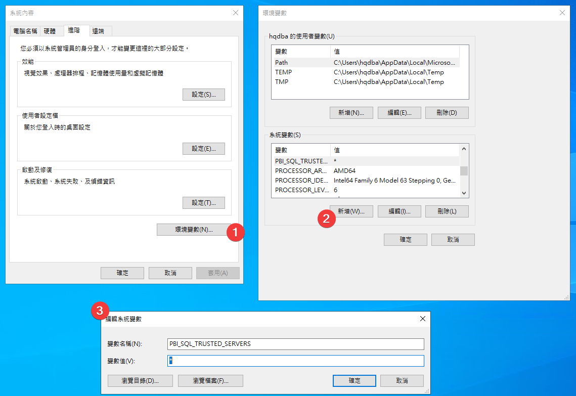 在系統變數加入 PBI_SQL_TRUSTED_SERVERS 並且設定允許的伺服器名稱 (可以使用 wildcard),之後重新啟動報表伺服器,即可解決問題 😃