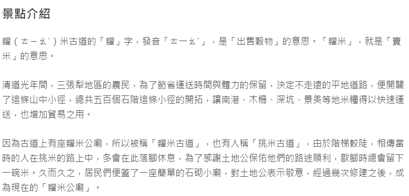 關於台北大縱走第六段路徑中「糶米古道的」文字與讀音探討。