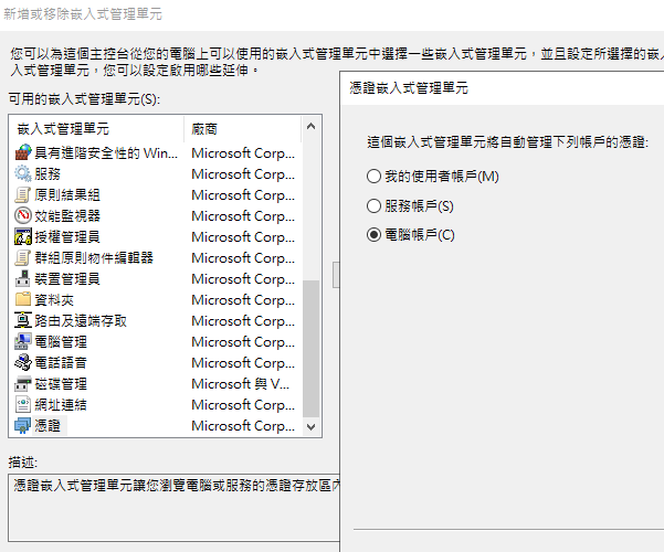 使用 mmc 開啟,使用「新增嵌入式管理單元」功能,選擇「憑證」,接著選擇「本機電腦」。