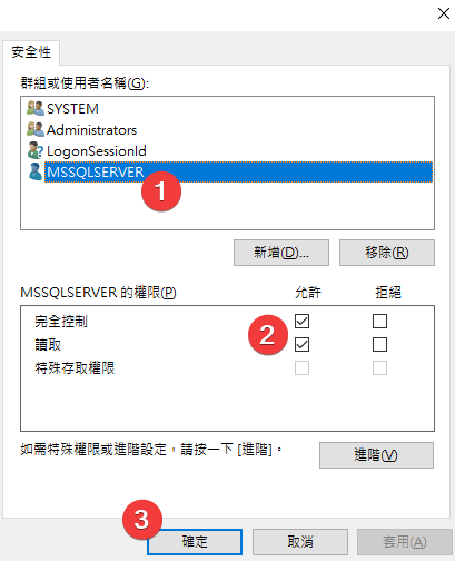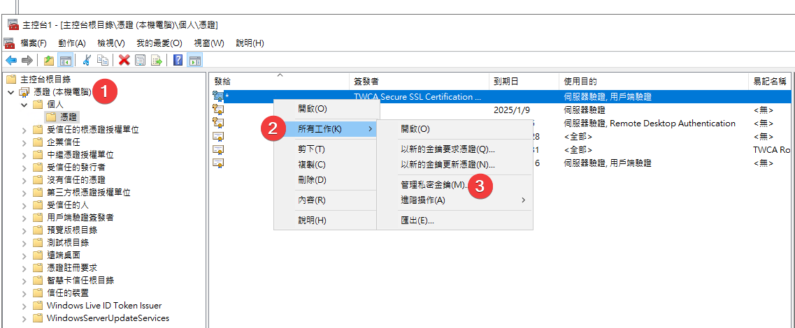 找到憑證後,使用「管理私密金鑰」功能,將 SQL Server 的服務帳號加入到憑證的存取權限中。