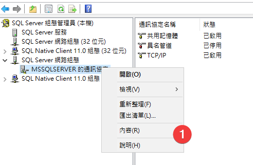 接著在使用 SQL Server 的組態管理員中,選擇「SQL Server 網路組態」在「憑證」選項中選擇剛才設定的憑證。