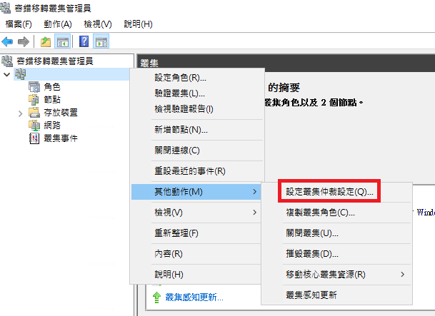 接著前往「Failover Cluster Manager」,在「叢集操作」中選擇「設定叢集仲裁設定」。